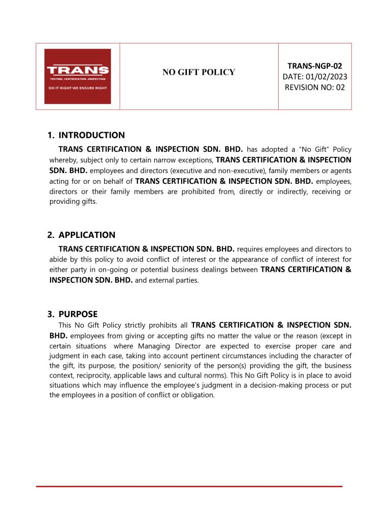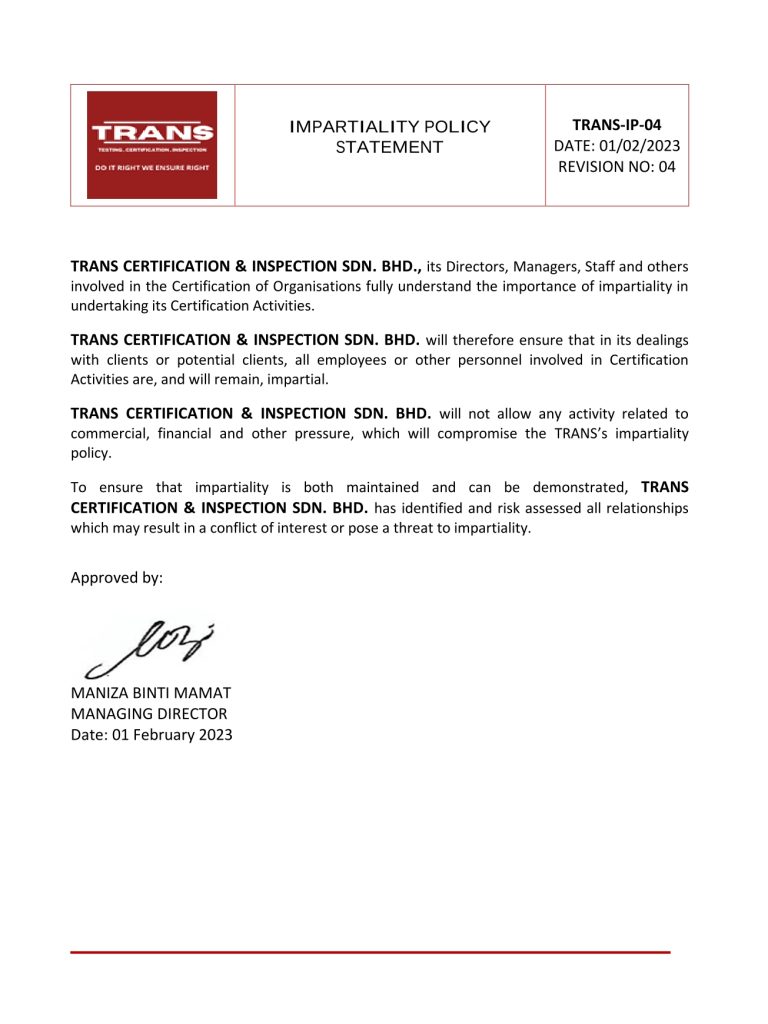 TRANS CERTIFICATION & INSPECTION SDN. BHD. (TRANS), its Directors, Managers, Staff and others involved in the Certification of Organisations fully understand the importance of impartiality in undertaking its Certification Activities.
