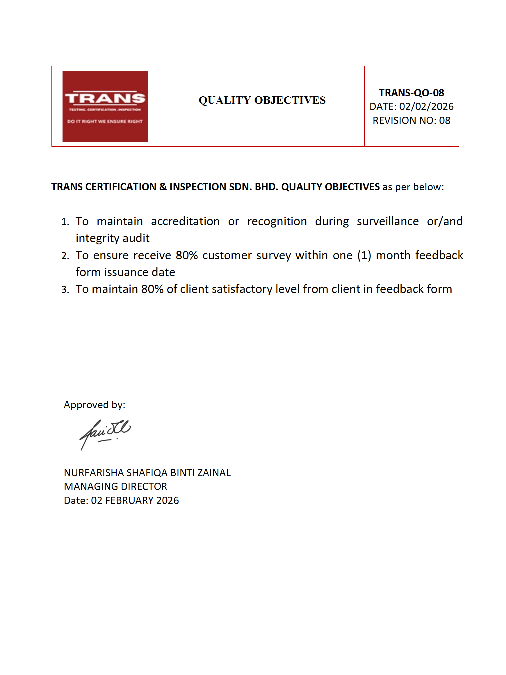 TRANS CERTIFICATION & INSPECTION SDN. BHD. (TRANS), its Directors, Managers, Staff and others involved in the Certification of Organisations fully understand the importance of impartiality in undertaking its Certification Activities.