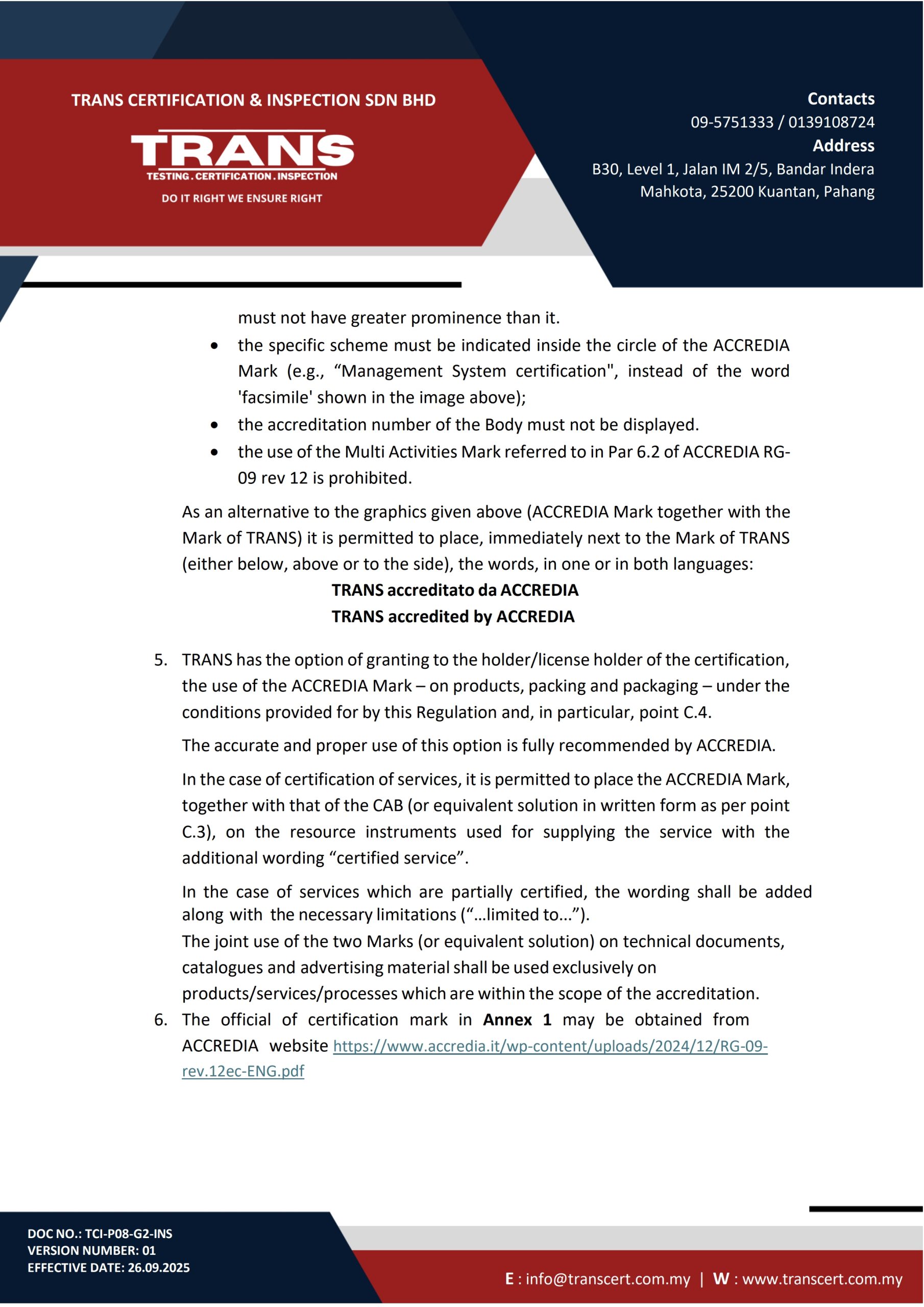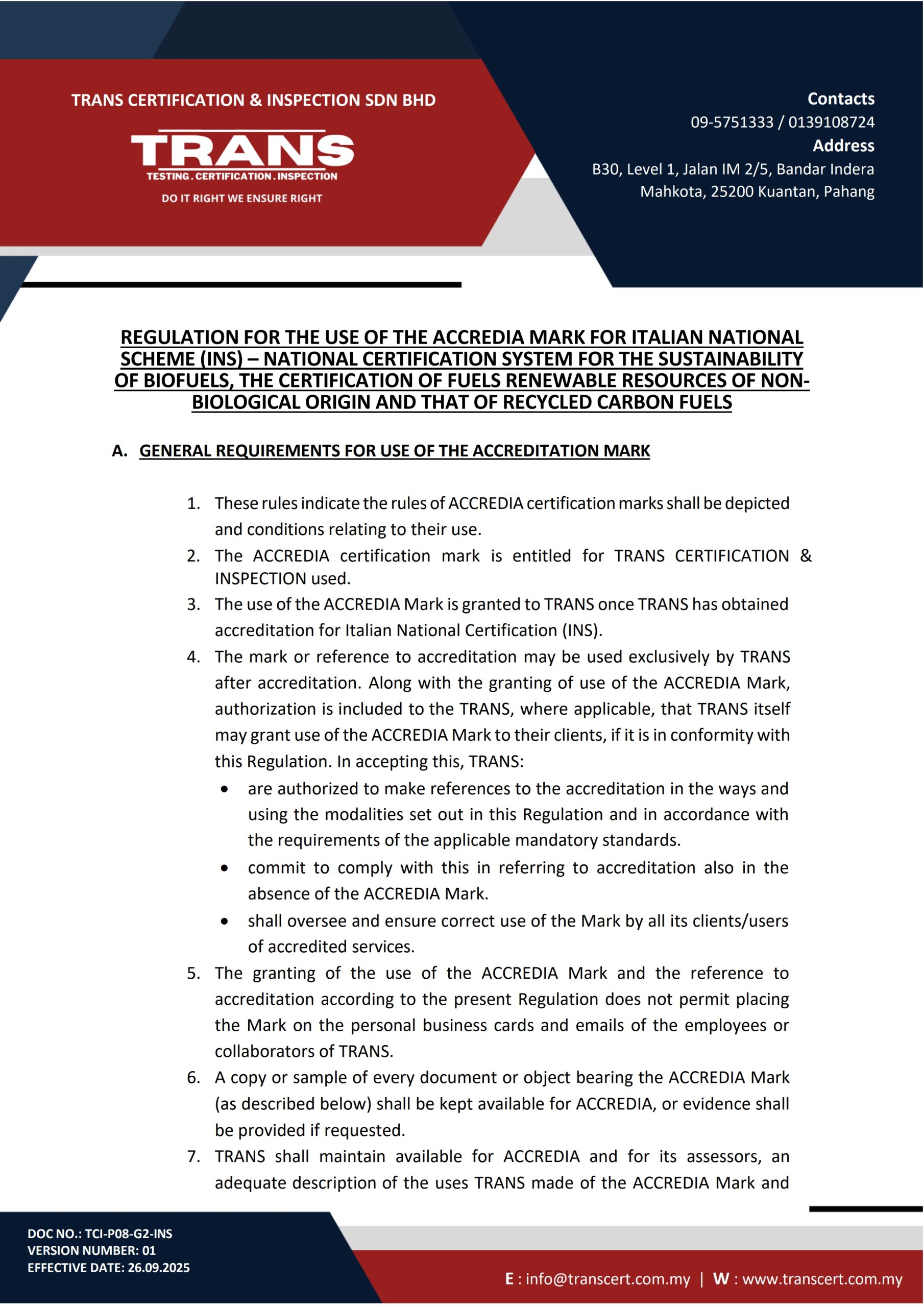 Regulation for the use of the Accredia Mark for Italian National Scheme (Ins) – Biofuel